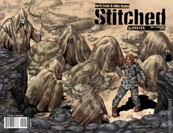 Garth Ennis' shocking tale of the supernatural behind enemy lines continues! Struggling to survive and stay one step ahead of Taliban forces and the horrific creatures they've dubbed 'The Stitched,' six American and British soldiers face certain death in the Afghanistan desert. Through information revealed by a captured combatant, the team begins to learn the mechanics of the shambling, corpse-like terrors which pursue them, but should they save their own skins or fight against the Stitched, who are tearing apart not only soldiers, but innocent civilians? Stitched #4 is available with a Regular cover, Wraparound cover, and Gore cover by series artist Mike Wolfer, and a special Stitched Movie Photo cover retailer incentive cover.