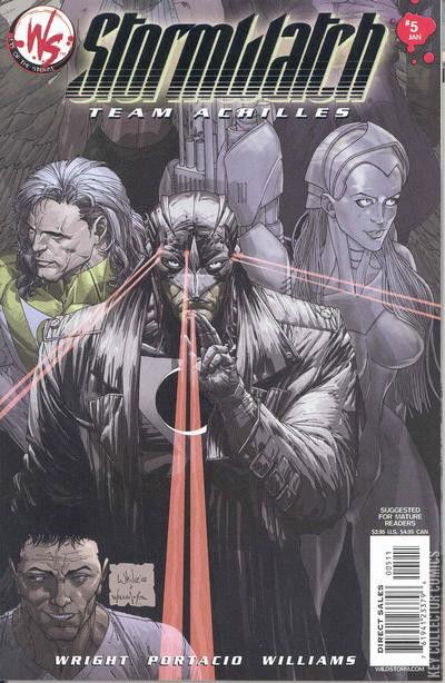 "Enemy Manipulation" Team Achilles is in Chechnya. More specifically, Blake Coleman is in the hand of a giant that's trying to eat him in Chechnya. Blake's holding his own though, firing endlessly into the open mouth of the giant. In hidden spots relatively close by Golovin and Pickney wonder if they should help him out. They decide that he can handle himself and they're right. Coleman drops a mine down the giant's throat and frees himself from the SPB's grip. Once he's loose he triggers the mine, killing the giant almost instantly. As he's running out of the path of the falling body, the story goes back to five days previous. Santini is outlining how their mission is going to go down. The main target is Dhul Fiqar and after he's dead everyone gets to go home. Pickney questions where they got all their info, stating that almost any government agency would only supply their unit with half-truths. Golovin sees something above Santini's head and asks permission to kill it, but Santini states that that's where they get their intel from. The thing above him is Buzz Dixon, an SPB with a body tailored to infiltration, stealth and observation. He goes on to talk about Buzz and then gets back to telling the team about the mission. Back in the present Blake Coleman is getting attacked by another monster, this time a six-breasted werewolf. Another flashback shows Marie Grunier trying to convince Santini to remove Cisco from the mission since he's suffering from psychological issues after the last fight. Santini refuses and because of that, Cisco is able to save Coleman from the she-wolf. He goes a little overboard though and brutally kills her when it wasn't necessary. Coleman reprimands him but does nothing else. At a remote location, Tefibi and Santini are monitoring the mission and going over why The Authority (Earth-50) controls Chechnya. It turns out that the only way they're able to monitor the mission is by looking at it through the Authority's technology. The Authority knows what they're doing though and after arguing amongst themselves about what they're going to do about it, Jack Hawksmoor, Midnighter and The Engineer decide to Door down to Chechnya. However, the tech-wizardry Tefibi pulled at the end of the last issue had some benefits other than just letting Team Achilles spy through Authority tech, it also allows him to redirect their Shift-Doors, keeping The Authority away from where the team is fighting. By the time they finally make it to Chechnya, most of Team Achilles is out of site and for some reason Hawksmoor is incapacitated just by being in the area. The Team Achilles snipers shoot at the downed Hawksmoor and Angie shoots back at where she thinks they are, but misses. Before she can realize it, Team Achilles' plan starts to come into shape. More terrorist SPB appear in the area and upon seeing The Authority they pick a fight with them and ignore the members of Team Achilles that are sneaking around. At the base where Santini and Tefibi are watching, a Russian ambassador that had been working with them comes in to chat. He asks about their progress and then unexpectedly pulls out gun and shoots Santini point blank in the chest!