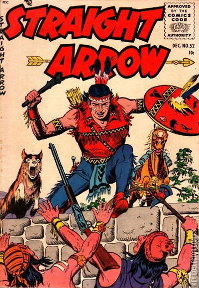 The rivalry between Tioga and an adopted Osage boy puts them both in danger; Red Hawk's friend Bigfoot is abducted by whatever is living in the abandoned "ghost huts"; An outlaw and his lawyer try to take Steve's land by legal subterfuge. Another dynamic cover by Fred Meagher featuring Straight Arrow's animal pals.