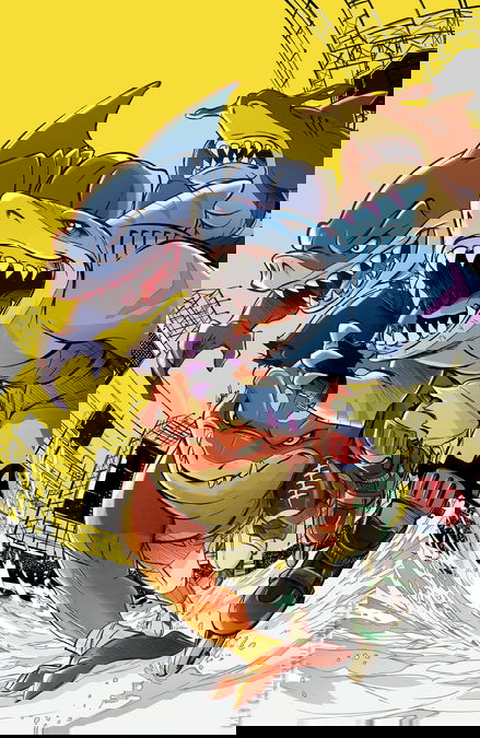 It’s Spirit Week at Fission University! Get ready for a week of pep rallies, alumni meetups, carnival rides, and…another villainous scheme!The Street Sharks discover a plot by Dr. Paradigm to gene-slam the football players and cheerleaders, making them into an army of athletic, subservient monsters! In order to stop Dr. Paradigm, the Sharks will need to go undercover during Spirit Week and save Fission City’s student population! But how do four giant talking sharks go undercover among crowds of human students? Well…you’re never going to believe what the school’s mascot is.