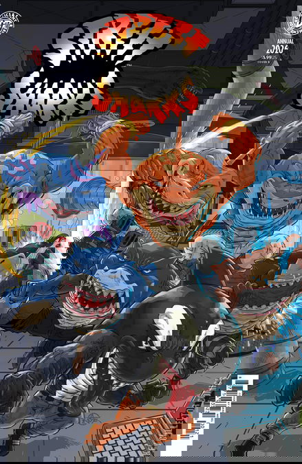 A new shark enters the fight—and this one’s a whale!The Street Sharks’ best friend and trusted ally, Moby Lick, is in town on the heels of one of the Sharks’ worst enemies. Evil businessman and big-game poacher Malcolm Medusa III and his trusted saboteur henchman, Clammando, have broken out of prison at the same time a dinosaur was found alive in a deep ocean trench. They’re set on capturing the dinosaur and cloning it to seed the next generation of fossil fuels! But they’ll need a scientist to make it happen, and who better than their last cellmate, Dr. Paradigm? The Street Sharks will need all the help they can get to stop all three of their greatest enemies!And in the backup story: With the lair all to himself, Bends invites a girl over for a dinner date. But when the Sharks are away, the Seaviates come out to play! Bends will be defenseless to stop them…or so he wants you to believe.