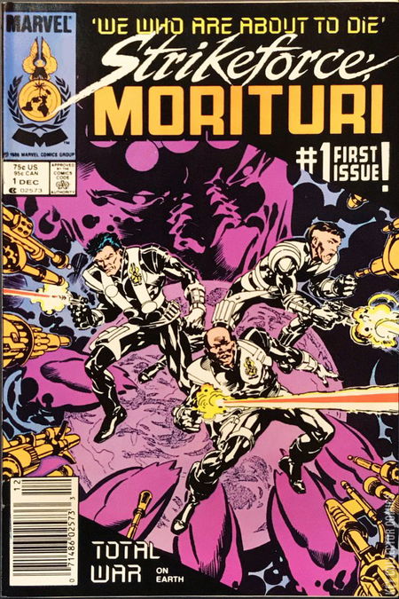 Total War on Earth. The challenge and responsibility of super heroism is explored like never before in this incredible series about normal men and women willing to make the ultimate self-sacrifice to save their world! The Earth of the near future has been invaded by aliens. Only one force is strong enough to confront them - Strikeforce Morituri! They are normal people who volunteer t become super heroes to save Earth - knowing that the transformation will ultimately kill them!