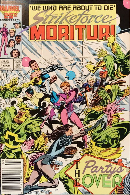 The Party's Over Fame glorifies the Strikeforce when a dramatic comic book of their adventures is released and a Strikeforce television program is announced! But the invading alien Horde has its own death-dealing plans for the star-studded hoopla - which results in the Strikeforce's first death!