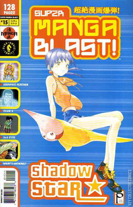 "It's five series for the price of two," SMB! is still one of the best deals in comics -- check it out! If you're not reading Super Manga Blast! you're missing out on some of the best comics from Japan! Shadow Star gets the spotlight this month, with 50 pages of kick-ass story! Shiina's father may start believing in angels, 'cause there's one flying outside his fighter plane -- and it's got a rapid-fire Vulcan cannon...! In Club 9, Haruo discovers the ghost of a dead student in her dorm room -- and it's got the hots for her! Maybe it's time to move in with her sexy friend Aki! Seraphic Feather continues as Kei apparently returns from the dead (again!) and secrets are uncovered about the mysterious explosion on the moon! Plus more 3x3 Eyes and What's Michael?!