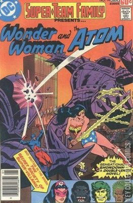 Wonder Woman & The Atom. "He's angry, this super-hero, and with reason: the woman he loves had been kidnapped, stolen by two members of an evil secret society...The irony is this: for months he has sought this woman across half a galaxy, only to trace her back to earth, her home...Now she is gone yet again...and the Atom is out for blood!"