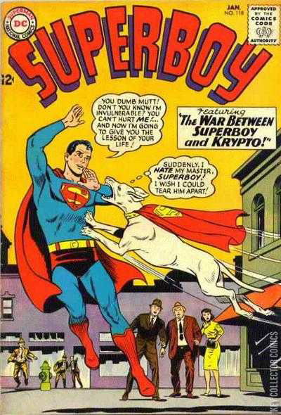 Salute to Courage (public service message / written by Jack Schiff) The Boy Who Unmasked Superboy! (Superboy, Ma and Pa Kent) The Kents are blackmailed because a boy knows who Superboy is. Doctor Rocket (gag strip by Henry Boltinoff) The Greatest Gladiator in Rome! (Superboy / Jerry Siegel) Superboy takes someone to ancient Roman times to give him confidence. The War Between Superboy and Krypto! (Superboy, Krypto, Superboy Revenge Squad, red Kryptonite / written by Otto Binder : reprinted in: Four Star Spectacular #6) Red Kryptonite makes Krypto and Superboy hate each other.