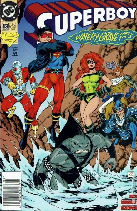 WATERY GRAVE, PART 1 OF 3 - SUICIDAL TENDENCIES! The government sponsored meta-human group Suicide Squad, super-villains forced by the government to pay their debt to society by going on suicide missions, recruits Knockout for the team. But when Deadshot and Captain Boomerang also recruit Sidearm and King Shark for their mission, Superboy decides to tag along to make sure these villains don't get out of hand.