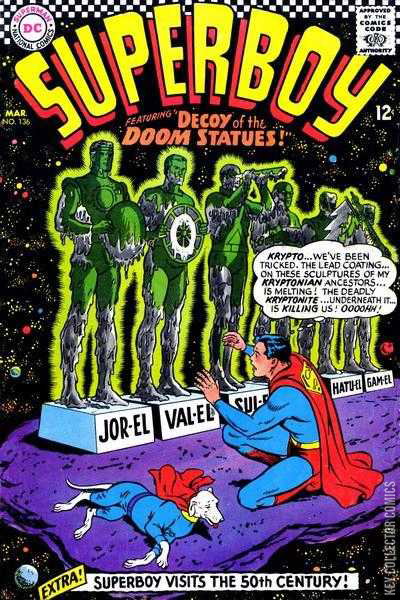 Superboy Visits the 50th Century! (Superboy, Lana Lang, Mrs. Lang, white Kryptonite / written by Otto Binder : reprinted from: Adventure Comics #279) Superboy is accidentally transported to the 50th century. How can white Kryptonite (something Superboy didn't know existed) help the people of the far future and prove to them Superboy is the real thing? A Hall of Fame Classic Decoy of the Doom Statues! (Superboy, Krypto, Space Canine Patrol Agents, Black Cats, Tricky Tom, green Kryptonite / written by Otto Binder) Krypto and the SCPA (Space Canine Patrol Agents) are reunited because the evil Black Cats set a trap for Superboy by having lead coated Kryptonite statues of Superboy's ancestors. Will a hound save Superboy as Prophetic Pup predicted?