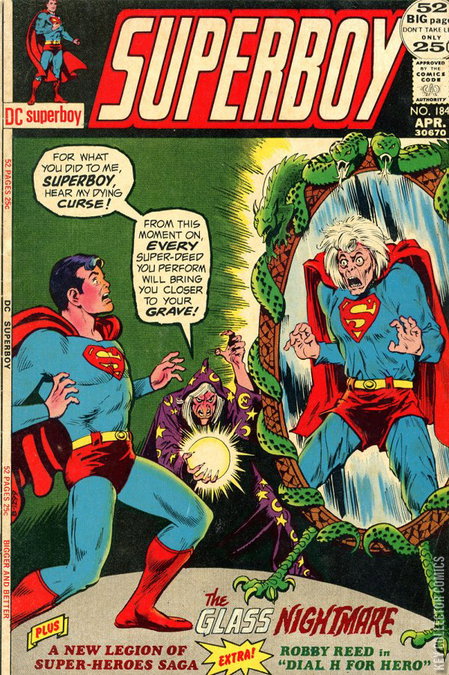 1. The Glass Nightmare (Superboy, Lana Lang, Ma and Pa Kent / written by Leo Dorfman) "For what you did to me, Superboy, hear my dying curse! From this moment on, every super-deed you perform will bring you closer to your grave!" 2. Dial H for Hero (Robby Reed / written by Dave Wood : reprinted from: House of Mystery #156) 3. One Legionnaire Must Go! (Legion of Super-Heroes / written by Cary Bates : reprinted in: Legion of Super-Heroes Archives #10) Was Matter Eater Lad framed?