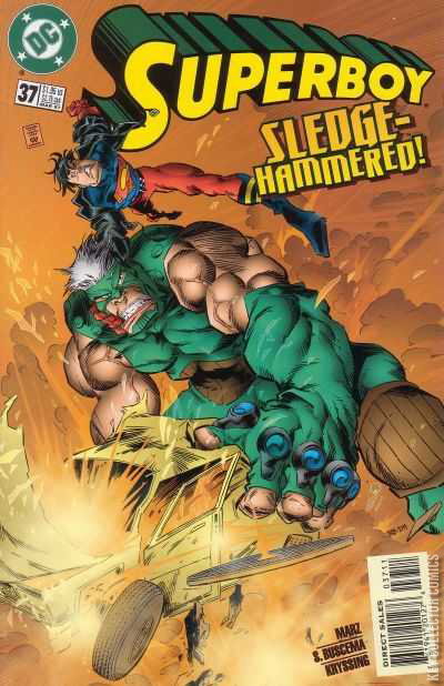 SLEDGE-HAMMERED! To get his mind off his girl problems, the Teen of Steel wishes for a rampaging super-villain he can go after. Be careful what you wish for. The Hulking villain known as Sledge is tearing a swath of destruction through the city and not even Superboy may be powerful enough to stop him.
