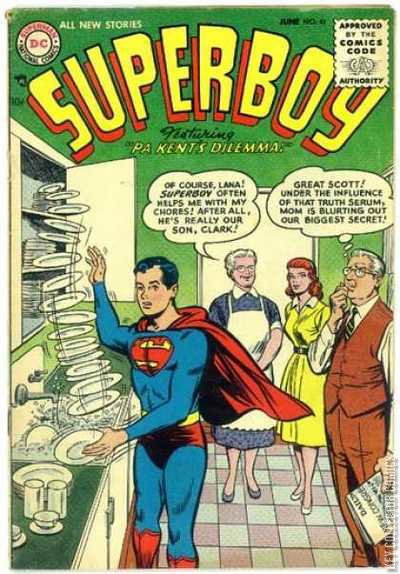 Superboy Meets Super-Brave! (Superboy, Kryptonite) Varsity Vic (gag strip by Henry Boltinoff) Daffy & Doodle (gag strip) The Junior Sleuths of Smallville! (Superboy, Lana Lang, Professor Lang) Self-Propelled Tractor (Superboy's Workshop) Crossed Off (full text story written by Jack Miller) Pa Kent's Dilemma! (Superboy, Ma and Pa Kent, Lana Lang) Ma Kent: Of course, Lana! Superboy often helps me with my chores! After all, he's really our son, Clark! Pa Kent: Great Scott! Under the influence of that truth serum, mom is blurting out our biggest secret! Peg (gag strip by Henry Boltinoff) There May Be a Career in Health for You! (public service message by Buzzy / written by Jack Schiff)