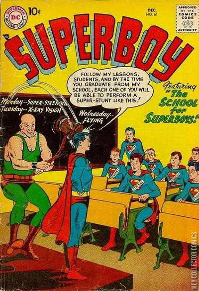The Trick is to Treat All the World's Children! (public service message / written by Jack Schiff) The Shrinking of Superboy (Superboy, Lana Lang, Professor Lang, Ma Kent : reprinted in: Adventure Comics #317) Ma Nature's Curiosity Shop (factual article) Little Pete (gag strip by Henry Boltinoff) The Well of Doom (Superboy, Lana Lang, Ma and Pa Kent, Kryptonite) Clark Kent falls in a well that has Kryptonite at the bottom. Everyone's wondering why doesn't Superboy rescue him? The First World Heavyweight Championship Fight (full text article) The School for Superboys (Superboy / written by Jerry Coleman) "Follow my lessons, students, and by the time you graduate from my school, each one of you will be able to perform a super-stunt like this!"