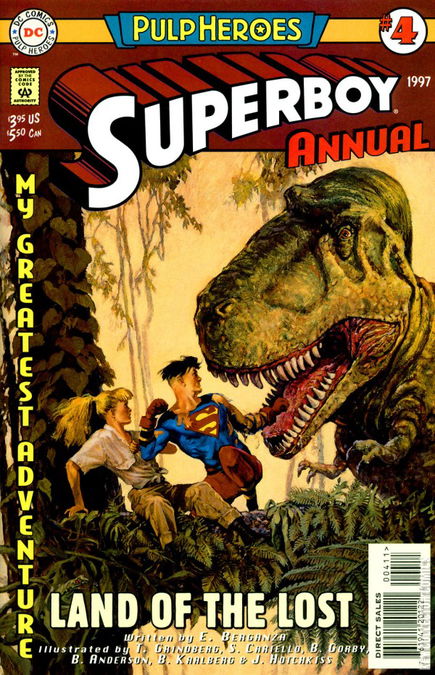 LAND OF THE LOST Pulp Heroes, the DCU Annuals event, continues with a story in the spirit of the adventure magazines of the 1930s. A cryptic message from Rex Leech leads Superboy and Roxy to a mysterious island where dinosaurs run free, Rex runs the natives, and Superboy gets to run around in a loincloth when he crowns himself 'King of the Jungle' and fights a giant white gorilla. 3 parts, each with a separate art team. Follow-up to the 'Blackout' story in the Superman titles, featuring the same island from that storyline.