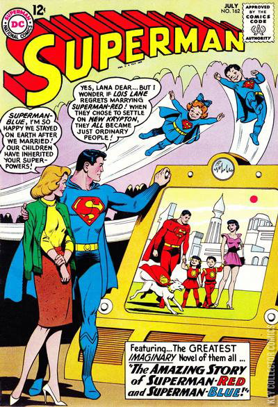 - Non-continuity story where Superman appears as two characters, one predominantly in a blue suit, the other in a red suit