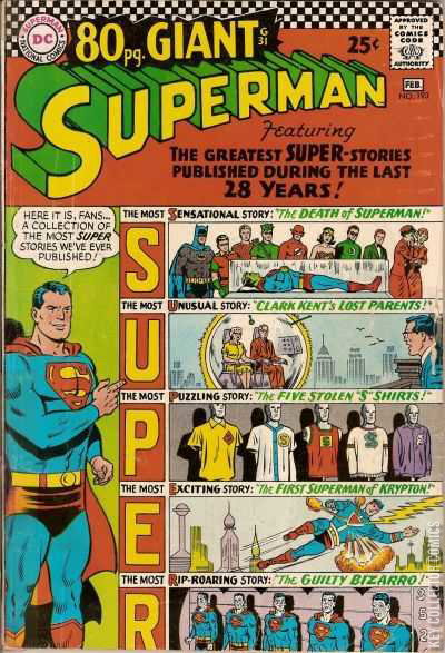 THE DEATH OF SUPERMAN! This story is reprinted from Superman #149. SUPERMAN'S LOST PARENTS! This story is reprinted from Action Comics #247. THE STOLEN 'S' SHIRTS This story is reprinted from Action Comics #197. THE FIRST SUPERMAN OF KRYPTON This story is reprinted from Action Comics #223. THE GUILTY BIZARRO!, OR, IT'S NICE TO BE WANTED! This story is reprinted from Adventure Comics #286.