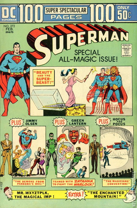 "Mr Mxyztplk Returns!" reprinted from Action Comics #80."The Demons From Pandora's Box!" reprinted from Superman's Pal, Jimmy Olsen #81."The Magicians' Convention!" reprinted from Action Comics #97."The Other Side Of The World!" reprinted from Green Lantern #42."The Enchanted Mountain!" reprinted from Action Comics #86."Beauty And The Super-Beast!" reprinted from Superman #165."Play The Graffiti Game With Superman" various black and white head shots of Clark Kent and Superman draw to look like famous individuals or given different looks by various artists. Reprinted in The Best of DC #1.