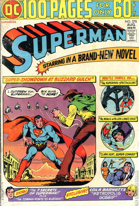 "Super-Showdown At Buzzard Gulch!""Lola Barnett's Metropolis Gossip!""The Mermaid From Atlantis" reprinted from Superman #138."The Compass Points To Murder" reprinted from Superman #33."The Seven Secrets Of Superman" reprinted from World's Finest Comics #62.Tricksy, World's Greatest Stunt Man"Clark Kent, Coward" reprinted from Action Comics #298."The Superman Spectaculars" reprinted from Action Comics #211.