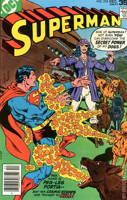Cover pencils by Rich Buckler, inks by Bob Oksner. The Wreck of the Cosmic Hound, script by Martin Pasko, pencils by Curt Swan, inks by Frank Chiaramonte; Superman has to help Peg-Leg Portia to escape from the world she has been stranded on.