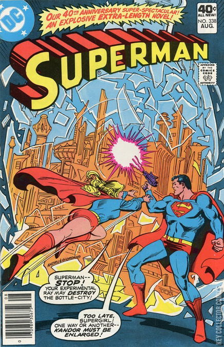 The story opens with Superman trying to get to the core of a supernova. He is clad in a space-suit and is armed with an energy absorption unit. He tries to absorb as much energy as the unit can take. With this energy, he will restore the Kandorians, inhabitants of the Bottle City to their original size. The Kandorians are relatives of Superman and Supergirl, who were shrunk by Braniac’s shrinking ray. Superman’s absorption unit’s shielding melts away in the extreme heat and the unit charges itself fully. Superman goes away from the Supernova. But returning to Earth, he feels dizzy due to the radiation overdose and faints. He starts falling through the atmosphere, but Supergirl catches him in mid-air. When Superman comes to his senses, he shows her the unit and says that the energy it contains might be enough to restore Bottle City to its original size. They come to the Fortress of Solitude. Superman speaks to the Kandorians via the com-link, telling them of his success in assimilating the energy needed for their restoration. The Kandorians thank him. But when one of them asks if the energy will be safe for them, Superman falls deep in thought. One Kandorian offers to volunteer himself for the test, but Superman refuses. He later talks with Kara, saying that he will subject himself to the test and will lure Braniac into shrinking him. Then they go out. The next day, Clark comes to his office to find it empty. Lois comes and takes him to Perry White’s 40 anniversary celebration. Other friends are relieves to see him. But in the middle of the function, suddenly the city starts shaking. Clark knows that Braniac has come for him and slips away. Superman flies out of the atmosphere and confronts Braniac. Braniac says that Superman’s sonic signal has brought him here. Superman tries to force Braniac to use his shrinking ray, but the latter just employs his force-fields to shake Supes off. Superman hurls a meteorite towards Braniac’s ship. This time Braniac deploys...