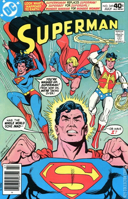 Cover pencils by Ross Andru, inks by Dick Giordano. The Turnabout Trap!, script by Martin Pasko, pencils by Curt Swan, inks by Frank Chiaramonte; Superman is confused to find himself in a world in which he's considered to be a villain, Wonder Woman is Wonder Warrior, and "Superman" is a female paired up with a blonde Superboy. Hostess Cup Cakes ad starring Batman, pencils by Curt Swan, inks by Vince Colletta.