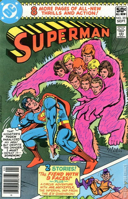 Cover pencils by Ross Andru, inks by Dick Giordano. The Fiend With Nine Faces!, script by Gerry Conway, pencils by Curt Swan, inks by Frank Chiaramonte; Superman destroys the energy monster accidentally created by Professor Tolkein. Mr. Mxyzptlk's Circus Caper!, script by Denny O'Neil, art by Jose Luis Garcia-Lopez; Juan Garcia helps Superman get rid of Mr. Mxyzptlk at the circus.