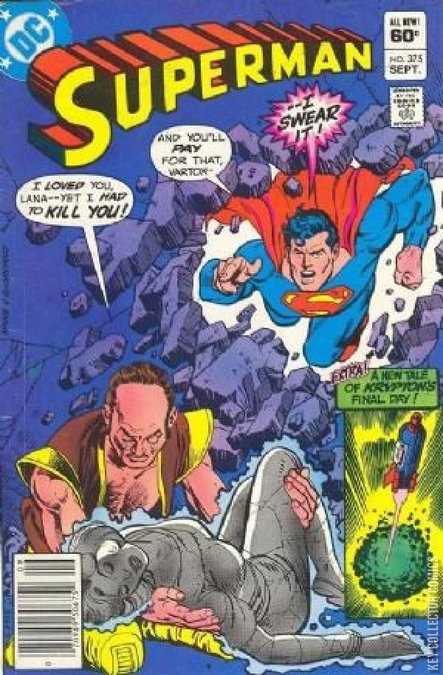 Cover pencils by Gil Kane, inks by Dick Giordano. The Stoning Of Lana Lang, script by Cary Bates, pencils by Curt Swan, inks by Dan Adkins; Vartox attacks Superman after being brainwashed by Syreena. Last Scoop on Krypton!--The Fabulous World of Krypton, script by Bob Rozakis, art by Gil Kane; A Kryptonian newsman discovers that Fel-Kar, a member of the Science Council, knows that Jor-El is conducting illegal experiments in space exploration, but doesn't understand why Fel-Kar has failed to take any action. Centerfold insert on glossy paper brings the total page count of 40.