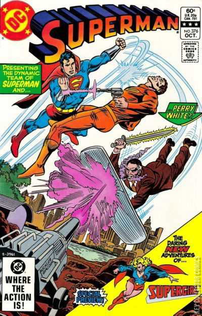 Cover pencils by Rich Buckler, inks by Frank Giacoia. The Ozone-Master Comes Calling!, script by Elliot S! Maggin, pencils by Curt Swan, inks by Dan Adkins; Perry White helps Superman stop the Ozone-Master. Untitled Supergirl story, script by Paul Kupperberg, pencils by Carmine Infantino, inks by Bob Oksner; Supergirl helps Superman stop a tornado and tells him of the changes she is going to make in her life; story continued between SUPERMAN FAMILY #222/DARING NEW ADVENTURES OF SUPERGIRL #1.