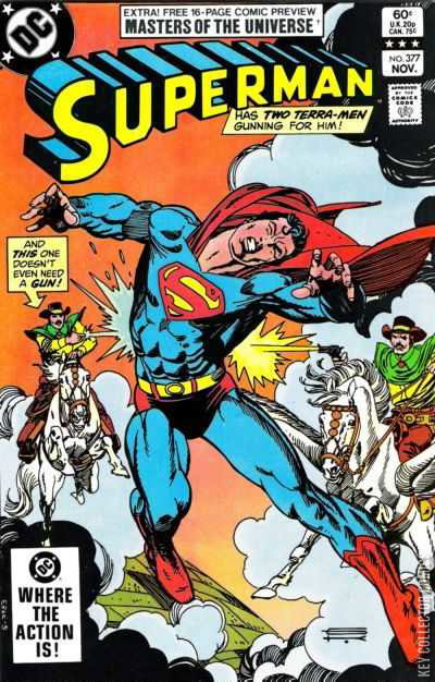 Cover art by Gil Kane. Terra Times Two!, script by Paul Kupperberg, pencils by Curt Swan, inks by Dave Hunt; Terra-Man lands on an alternate Earth where Magic exists instead of Science, meets his twin and the two Terra-Men decide to take on Superman. Fate Is The Killer featuring Masters Of The Universe, script by Paul Kupperberg, pencils by Curt Swan, inks by Dave Hunt; stars He-Man, Skeletor, and Superman. Masters of the Universe preview story.