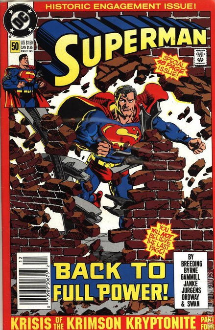 Krisis of the Krimson Kryptonite. Part 4 of 4. Special Extra-Sized issue. "The Human Factor!" Cameos by the Guardian and Gangbuster. Superman has been rendered powerless, beaten, and humiliated by his arch nemesis, Lex Luthor. But when Luthor's own arrogance causes him to break the rules of the game set forth by Mr. Mxyzptlk, can a fully restored Man of Steel be far behind? Plus, Lois Lane gives Clark Kent her answer to his marriage proposal.Note: This issue features a humorous cameo by Marvel's First Family - the Fantastic Four.The cover of this issue is said to have been a tribute to the George Reeves version of Superman. Second printing with UPC in lower left corner and ‘Historic Engagement Issue’ at the top
