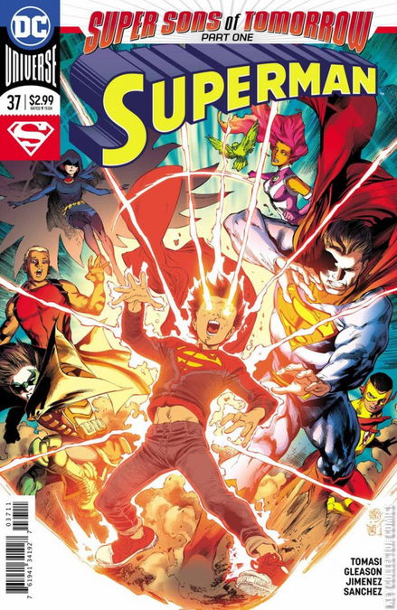 SUPER SONS OF TOMORROW, PART 1 - DARK OF THE SON The Batman of Tomorrow travels to the present to prevent a cataclysmic disaster before it happens, revealing that Superboy will soon be responsible for the death of millions. But Superman will do anything to protect his son…and the Batman of Tomorrow is unwavering in his resolve to take down the Boy of Steel. Don’t miss a clash of titanic proportion in the opening chapter of this game-changing story! Continued in Super Sons #11