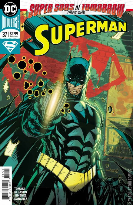 SUPER SONS OF TOMORROW, PART 1 - DARK OF THE SON The Batman of Tomorrow travels to the present to prevent a cataclysmic disaster before it happens, revealing that Superboy will soon be responsible for the death of millions. But Superman will do anything to protect his son…and the Batman of Tomorrow is unwavering in his resolve to take down the Boy of Steel. Don’t miss a clash of titanic proportion in the opening chapter of this game-changing story! Continued in Super Sons #11