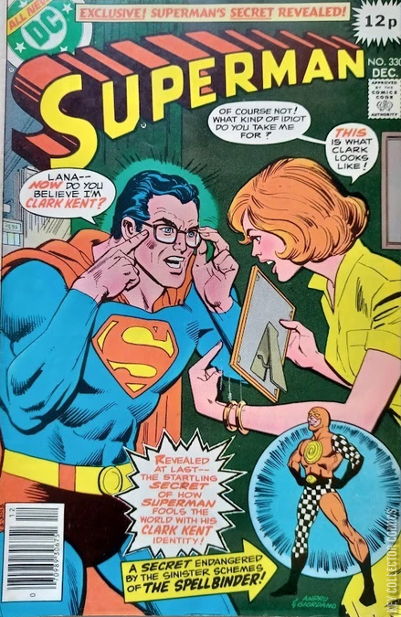Superman: Lana-- Now do you believe I'm Clark Kent?Lana Lang: Of course not! What kind of idiot do you take me for? This is what Clark looks like!"Revealed at last-- the startling secret of how Superman fools the world with his Clark Kent identity! A secret endangered by the sinister schemes of the Spellbinder!"