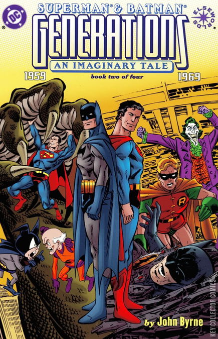 1959: STRANGE DAYS Batman has followed a wooden building in Gotham City that has somehow sprouted legs. Setting his Bat-Gyro on auto-pilot, he lassos the building and rides it like a bucking bronco, trying to get it to calm down. After he does, he calls out to the one he believes is responsible for this trick -- Bat-Mite. To his surprise, Mister Mxyzptlk shows up, revealing himself to be the one responsible. Meanwhile, Jimmy Olsen uses a special mind-communicating machine to get Superman, now turned into a green giant due to exposure to Red Kryptonite, to put down an ocean liner he has in his hands. Soon the Red Kryptonite effect wears off, and he is back to his normal self. Superman greets Jimmy gratefully on the Daily Planet helicopter roof when Bat-Mite shows up. They both explain why they now appear to each other's heroes: a couple of space pilots from Epsilon Eridani have taken both imps from their home dimensions to help find a suitable champion that would defeat the Bortan, an alien race that has destroyed many Eridaniites and enslaved the rest. Seeing the great superheroes of Earth in action, particularly Superman and Batman, two Eridainiites were chosen for the mission of contacting them, and so they used their technology to bring the two imps on board, knowing how capable they were in testing their own champions' abilities. They were now to test the other's champion so that the Eridaniites would know which superhero they should take back home. To prove that neither hero has a choice of backing out, Bat-Mite proceeds on making a giant green monster from a billboard in Metropolis come alive, while Mxyzptlk makes a giant menacing robot appear in Gotham City. At home in the Kents' residence, Lois Kent deals with her young daughter Kara finding herself floating a few inches off the ground, which is scaring her. Lois finds a special red amulet that emits red solar radiation that she puts around Kara's neck, enabling her to live a normal life. Over at the Wayne Estate, Alfred the butler finds his master's son Bruce Wayne, Jr. testing out his Uncle Dick's Robin costume and doing workouts in the Batcave in the hopes that he will someday become the Boy Wonder. As both Batman and Superman struggle with the giant creatures created by the two imps, Superman finally decides to transport both the imp and his monster to Gotham City, where the two monsters end up struggling with each other. Mxyzptlk decides to create an even bigger monster, one that spews flames from its tentacles, as a last-ditch effort for either Superman or Batman to be chosen. Batman is prompted to flee on his Bat-Gyro, but Bat-Mite grabs the flying vehicle, causing Batman to almost be toasted by the giant creature. Superman comes to his rescue, only for both of them to be knocked flat to the ground where they were both crushed. As both Bat-Mite and Mxyzptlk argue with each other over how "brilliant" each other's creation was, the Eridaniites hover overhead and decide to take the two imps back home with them. As they depart, the monsters vanish, and Superman and Batman arise safely from the impact zone, grateful that the aliens fell for the ruse of their playing dead, and grateful for Superman's split-second timing. Soon after, Lex Luthor appears unto young Joel Kent to tell the lad something. 1969: CHANGING TIMES President Richard Nixon calls the assembled heroes, Superman, Batman, Wonder Woman, the Flash, and Green Lantern, to do something about the picketers outside the White House protesting the Vietnam War. They vocally refuse to, stating that the people have a constitutional right to protest. The President then demands them to stop the war, but Superman says that the issue isn't black-or-white. After being demanded to leave, Superman talks to Batman (who is now Dick Grayson) about Bruce Wayne, Jr.'s decision to retire his identity as Robin to be enlisted as a soldier in the Vietnam War as well as his own inability to contact his son Joel Kent ever since he went off to war. At the grave site of Alfred Pennyworth, Bruce Wayne communicates with the ghost of Alfred his own thoughts concerning his son going off to war as well as those about Batman being too comfortable as a public image to be fear-inducing as it once was. Alfred tells Bruce that there are greater fears in the world to worry about, which is why the people need something that they can rely on, such as the Batman. Meanwhile, Bruce Wayne, Jr. is helping as Robin to crack the case of the "Joker, Junior", whom the Joker claims is neither his son nor a trained protégé despite being able to elude the police for years. Both he and Dick are frustrated as their last attempt to ascertain the identity of "Joker, Junior" from the Joker himself proved fruitless. In Metropolis, Lois Kent learns that she now has cancer, which startles the teenage Kara who is just starting her superheroic career as Supergirl. She tries to assure her mother that her father will find a way to cure her, but Lois already knows the various attempts Superman has tried for cures to diseases were all failures, all of them from alien worlds that only worked on alien physiology. Lois feels resigned to her fate to die and tells Kara not to talk anymore about it as she flies her mother back home. In Southeast Asia somewhere near Vietnam, Joel Kent's troops got lost and are beginning to worry that their commanding officer has led them to where they could be ambushed when Joel reappears, stating that he has found a possible village that's hiding Viet Cong troops. Though they lay waste to the village, the troops find no possible evidence for any troops being there and so beg for Joel to order a retreat. Ignoring the request, Joel decides to massacre the survivors in order not to let their "Commie masters" know that the U.S. troops have been there. One of Kent's soldiers realizes that this has gone far enough as he cocks his pistol, ready to fire. At the Batcave, as they receive a clue from "Joker, Junio