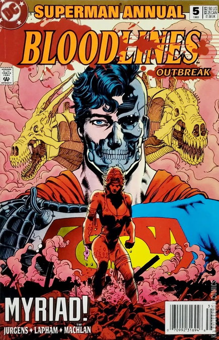 BLOODLINE: OUTBREAK PART 6 - MYRIAD Continued from The New Titans Annual #9 So greedy are the alien parasites Gemir and Venev that they stoop to attacking even dead humans, one of whom is a woman recently killed by Lex Luthor II. Myriad, this Annual's New Blood infusion into the DC Universe, joins with the new Superman (Cyborg Superman) in an effort to learn more about each of their forgotten pasts. Continues in Green Lantern Annual #2