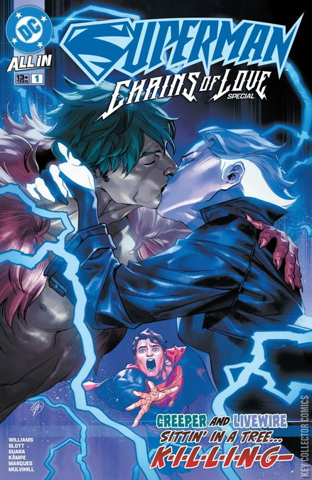 LIVEWIRE AND THE CREEPER FORGE A DEADLY NEW VILLAINOUS ALLIANCE! AND THEY MAKE OUT! GROSS! Love is in the air--also death--in Superman: Chains of Love Special! Step aside Daily Planet--a new news force is taking the city of Metropolis by storm! When the former felon Livewire is released from prison, an unholy alliance and (frankly, wholesome) romance with the Creeper is forged in the fires of a super-villain battle! But with two of Metropolis’s most notorious shock-jock media personalities getting together comes the debut of a new outlet to rival even that of the Daily Planet. Witness the rise of the Wiretap and some shocking surprises in the Superman: Chains of Love Special!
