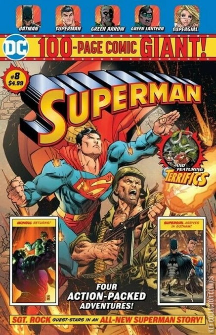 UP IN THE SKY PART 6 - JUST A LITTLE FARTHER! A detour through time lands the Man of Steel on the battlefields of World War II next to Sgt. Rock and the combat happy joes of Easy Company! THE SUPERGIRL FROM KRYPTON PART 1 - ALONE This story is reprinted from Superman/Batman #8. A PERFECT LIFE PART 2 This story is reprinted from Green Lantern (Volume 4) #8. TOM STRONG & THE TERRIFICS PART 2 This story is reprinted from The Terrifics #8.