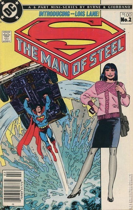 In this issue Lois Lane drives off a pier in order to get Superman's attention so she can interview him for The Daily Planet. In addition, Clark writes his first story for the Planet. Unlike the pre-Crisis Lois Lane, the revised Lois doesn't spend time trying to uncover Superman's secret identity (since no one knows he has a secret identity).