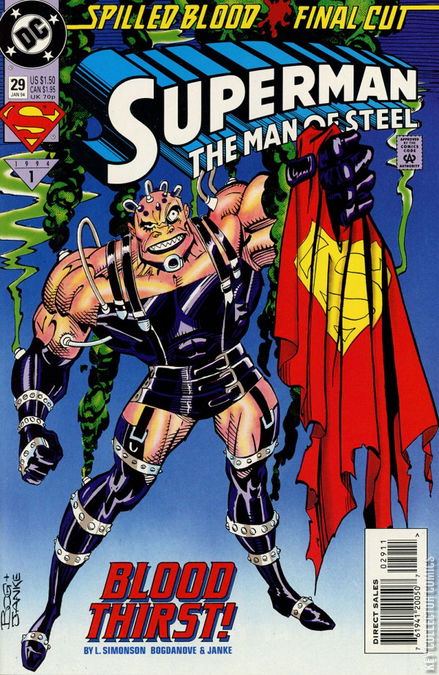 Part 3 of the 3-part 'Spilled Blood,' continued from Action Comics (1938 DC) #694. The mastermind behind Bloodsport and Hi-Tech's recent Metropolis massacres takes center stage as the man called Bloodthirst declares war on Superman.