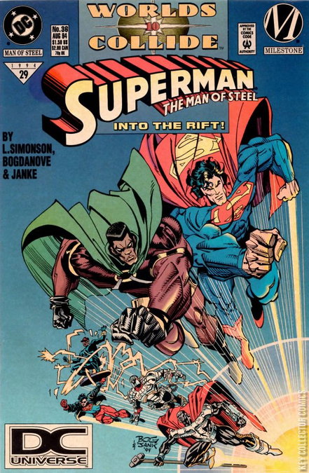 WORLDS COLLIDE, PART 10 - A RIFT IN REALITY Continued from Hardware #18 Superman and Icon, the most powerful heroes of their respective worlds, take on the inter-dimensional menace Rift in an all-out battle to save Metropolis and Dakota. Continues in Icon #16