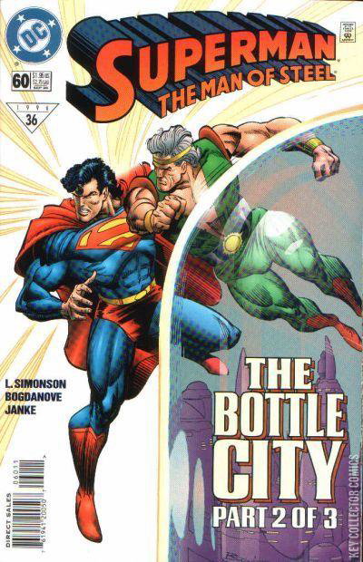 Cover pencils by Jon Bogdanove, inks by Dennis Janke. Shattered Lives starring Superman, Tolos, Cil Gand, Perry White, and Lori Lemaris, script by Louise Simonson, pencils by Jon Bogdanove, inks by Dennis Janke; The Bottle City Part 2 of 3; story continued from ACTION #725, continues in SUPERMAN #116.