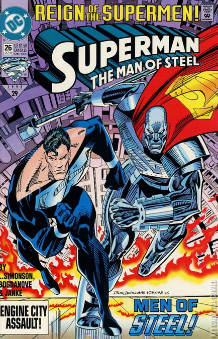 REIGN OF THE SUPERMEN! PART 18 - BLAST OFF! Continued from Action Comics #691 It's do or die (again?) as the Men of Steel invade Mongul's Engine City! Continues in Green Lantern #46 and Superman #82