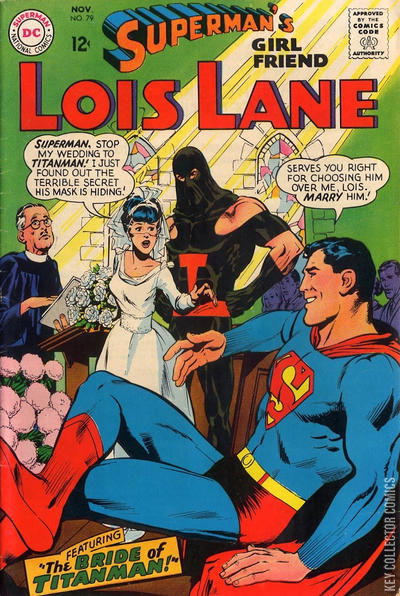 Cover by Neal Adams."The Bride of Titanman!" written by Richard Hughes, penciled and inked by Kurt Schaffenberger. (Lois Lane, Superman, Jimmy Olsen, Perry White (in a dream)"Checkmate for Lois!" written by E. Nelson Bridwell, penciled and inked by Kurt Schaffenberger. (Lois, Superman, Lana Lang, Jimmy, Perry, Lewis Lang : a chess related adventure)Lois Lane: Superman, stop my wedding to Titanman! I just found out the terrible secret his mask is hiding!Superman: Serves you right for choosing him over me, Lois. Marry him!