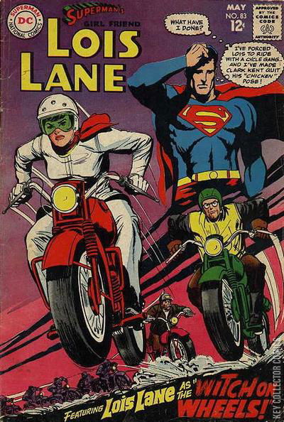 Cover by Neal Adams."Witch on Wheels!" (part 1) "The Super-Cyclist!" (part 2) written by Frank Robbins, penciled by Irv Novick and inked by Mike Esposito.Superman (thought): What have I done? I've forced Lois to ride with a cycle gang. And I've made Clark Kent quit his "chicken" pose!