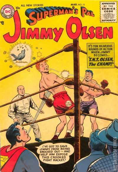 Superman's Seeing-Eye Dog (Jimmy Olsen, Superman, Lois Lane, Perry White / written by Otto Binder) -- 2. Jerry Jitterbug (gag strip by Henry Boltinoff) -- 3. Healthy Teeth for You and Your Pet! (public service message from Binky / written by Jack Schiff) -- 4. Jimmy Olsen, Clark Kent's Pal! (Jimmy Olsen, Superman, Perry White / written by Otto Binder) -- 5. Peg (gag strip by Henry Boltinoff) -- 6. How Houdini Performed His Tricks (full text article by John Maxon) -- 7. T.N.T. Olsen, the Champ! (Jimmy Olsen, Superman, Lois Lane / written by Otto Binder) Superman: I've got to save Jimmy from being knocked out--and help him expose this crooked fight racket!