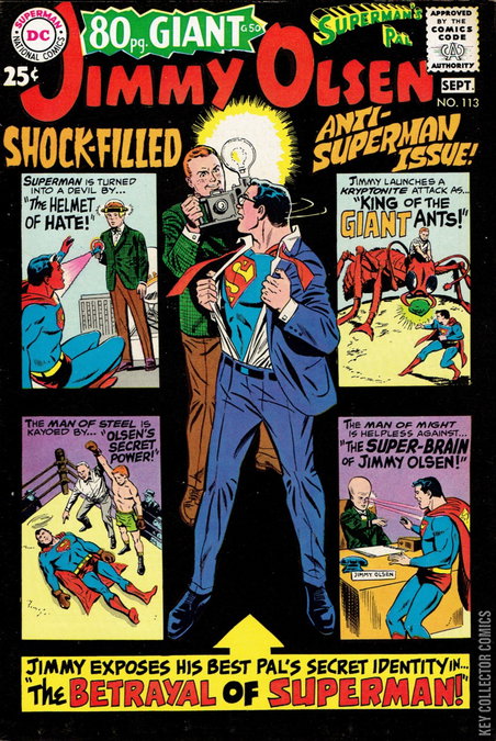 An 80 page Giant G-50 all reprint issue.Cover by Ross Andru and Mike Esposito."The Super-Brain of Jimmy Olsen" Reprinted from Superman's Pal Jimmy Olsen #22."The Helmet of Hate!" Reprinted from Superman's Pal Jimmy Olsen #68."The Outlaw Jimmy Olsen" Reprinted from Superman's Pal Jimmy Olsen #27."Superman Around the World!" A 2 page spread showing the covers of 8 Superman Comics from Italy "Nembo Kid", Sweden "Stalmannen", Brazil "Superman", Mexico "Superman", Lebenon (sic) "unprintable", Holland "Superman Album", Germany "Superman und Batman" and Finland "Terasmies"."The Betrayal of Superman" Reprinted from Superman's Pal Jimmy Olsen #8."Jimmy Olsen's Secret Power!" Reprinted from Superman's Pal Jimmy Olsen #55."The Boy who killed Superman" Reprinted from Superman's Pal Jimmy Olsen #28."Jimmy Olsen, Juvenile Delinquent!" Reprinted from Superman's Pal Jimmy Olsen #40."King of the Giant Ants!" Reprinted from Superman's Pal Jimmy Olsen #54."Superman and his friends Around the World!" 1 page text piece describing the foreign country names and the popularity of DC Comics super-heroes around the world.