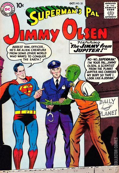 The Super Nose for News (Jimmy Olsen, Superman, Lois Lane, Perry White, Professor Potter / written by Otto Binder : reprinted in: 80 Page Giant #2) Jimmy inhales Professor Potter's Pinocchio serum. What happens when Lois thinks of using it on Clark to see if he's Superman?Lost -- A Free Education! (a public service message by Binky / written by Jack Schiff) The Rock 'N' Roll Superman (Jimmy Olsen, Superman / written by Otto Binder) Can Jimmy fill in for his rock star cousin?Casey the Cop (gag strip by Henry Boltinoff) The Jimmy Olsen from Jupiter (Jimmy Olsen, Superman, Lois Lane, Perry White / written by Alvin Schwartz : Reprinted: in 80 Page Giant #2, The Greatest 1950s Stories Ever Told, 1990) What happens when Jimmy is turned into a Jovian who can read minds? One thing is Jimmy goes to Clark Kent to see if he's Superman!Also included is the first letters page.