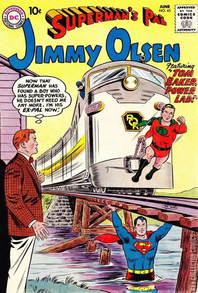 "Tom Baker, Power Lad!" (Jimmy Olsen, Superman, Lois Lane, Perry White, Lucy Lane, Supergirl, Daily Planet / written by Otto Binder) Is Power-Lad all he is cracked up to be? The Gunsmoke Kid! (Jimmy Olsen, Superman, Professor Potter, Jesse James, Wyatt Earp, Bill Hickok, Bat Masterson) Jimmy is transported back in time into the old West, and other criminals think he's the Gunsmoke Kid!Peg (gag strip by Henry Boltinoff) The Animal Master of Metropolis! (Jimmy Olsen, Superman, Perry White, Lois Lane, Krypto / written by Robert Bernstein : reprinted in: Superman's Pal, Jimmy Olsen #131) Jimmy gets a wand that lets him control animals. Will he go along with some crooks and fix a horse race? Be Your Own Boss! (public service message / written by Jack Schiff)