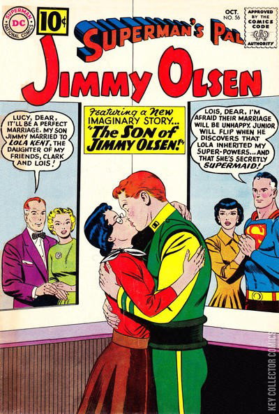 The Son of Jimmy Olsen! (an imaginary story starring Jimmy Olsen, Superman, Lois Lane, Lucy Lane, Lex Luthor / written by Jerry Siegel : reprinted in: Superman's Pal, Jimmy Olsen #117) Jimmy Jr. wants to marry Lola Kent, but she has super-powers. Peg (gag strip by Henry Boltinoff) The Jinx of Metropolis! (Jimmy Olsen, Superman, Lois Lane, Perry White, Jor-El, Lara, President Kennedy / written by Jerry Siegel) Jimmy finds a small object that makes bad things happen around him. Can he find out in time?Moolah the Mystic (gag strip by Henry Boltinoff) Jimmy Olsen's Sweethearts! (Jimmy Olsen, Lucy Lane, Lois Lane, Marilyn Monroe and other Hollywood stars / written by Robert Bernstein) In Hollywood, Jimmy is seen with Marilyn Monroe and other stars. Will this make Lucy Lane mad as part of Jimmy's (who is mad because she stood him up) plan? Note: All of the movie stars who appeared in this issue were in fact look-alikes.