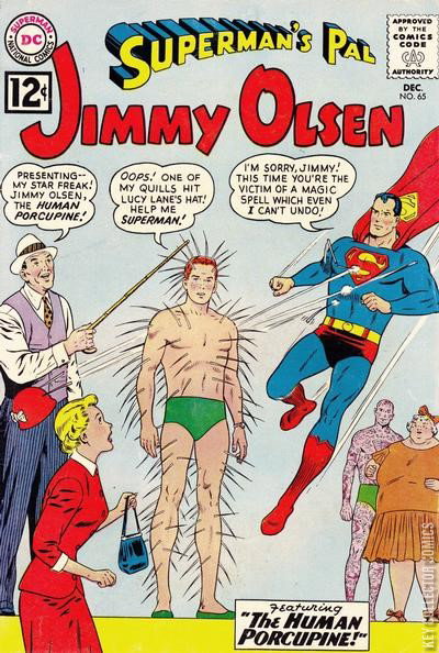 The Alien Jimmy Olsen Fan Club (Jimmy Olsen, Superman, Lucy Lane, Jimmy Olsen Fan Club / written by Jerry Siegel)Jimmy goes to the planet Rax to meet his fan club there, but they think he's an imposter, and they want to sentence him to death!Pennies for UNICEF! (public service message by Superman, Joe and Tom / written by Jack Schiff)The Human Porcupine (Jimmy Olsen, Superman, Lois Lane, Perry White / written by Jerry Siegel)Jimmy spurns Miss Gzptlsnz's affections, so she turns him into a human porcupine. Will Jimmy have to marry her to change himself back? Miss Gzptlsnz wants Jimmy to marry her and will turn him into a porcupine until he says yes!Peg (gag strip by Henry Boltinoff)Shorty (gag strip by Henry Boltinoff)The Mysterious Lord of Devil's Island! (Jimmy Olsen, Superman, Lois Lane, Lois Lane Fan Club / written by Robert Bernstein)Jimmy dreams that he has been transported to medieval France and is arrested and sent to a prison on Devil’s Island. He bargains to be set free by Lord L, who turns out to be Lucifer himself!Tricksy (gag strip by Henry Boltinoff)
