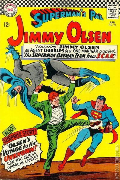 The Man from S.C.A.R. comes in 2 parts: part 1. The Man from S.C.A.R. part 2. The Fire Man from Pyron(starring Jimmy Olsen, Superman, Batman, Lois Lane, Perry White, Supergirl (cameo), Streaky (cameo), Comet (cameo), Kryptonite / written by Leo Dorfman)Jimmy, Superman and Batman vs. The Society for Conquest and Ruin (SCAR)Cap's Hobby Hints (by Henry Boltinoff) Jimmy Olsen's Journey to Nowhere! (Jimmy Olsen, Superman / written by Leo Dorfman) "'Olsen's Voyage to the Unknown!' Can you guess where he lands?"